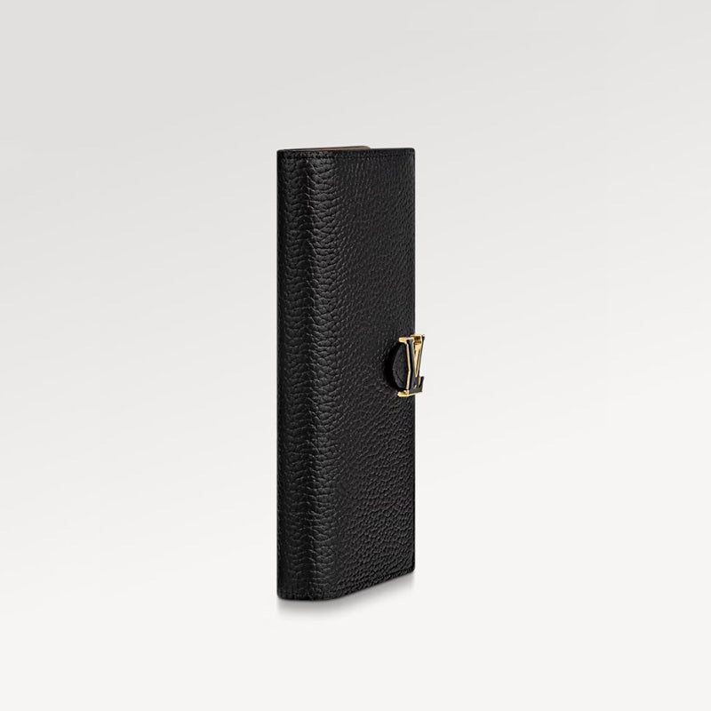 • グレイン(しぼ)のある柔らかなトリヨンレザーでエレガントに仕上げた「LV ヴェルティカル ウォレット」。コントラストカラーのライニングを施した内装には、8つのカードスロット、ファスナー付きコインポケット、チケットや紙幣用の大ぶりの「V」シェイプのスロットを備えています。独特のスライドスタイルの留め具には、アイコニックなバッグ「カプシーヌ」から着想を得たLV イニシャルのアクセサリーをあしらいました。