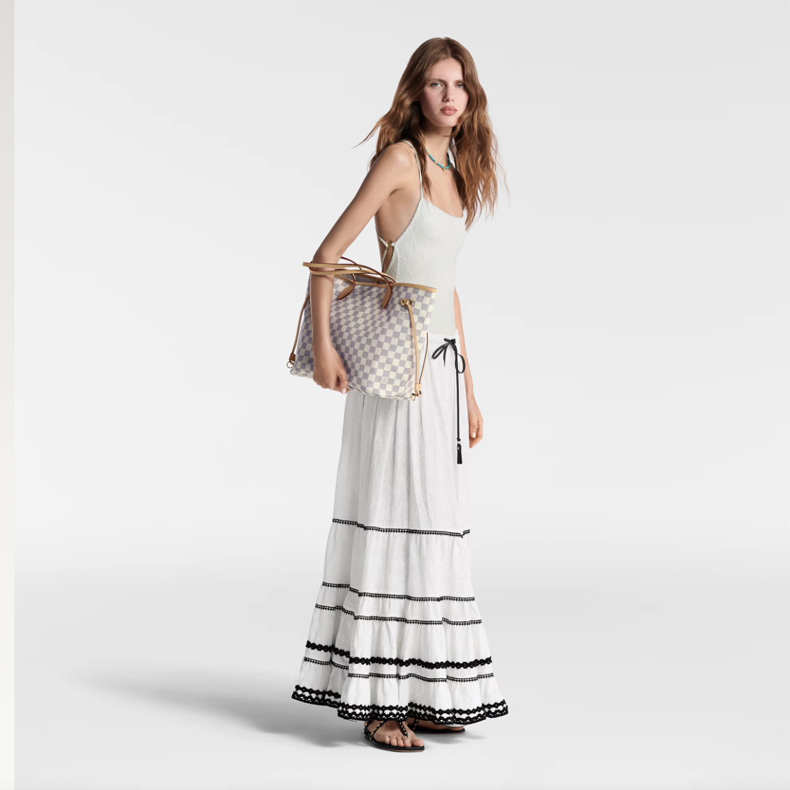 - タイムレスなデザインと伝統的なディテールが融合した「ネヴァーフル MM」。フレッシュなダミエ・アズール キャンバスにヌメ革のトリミングをあしらった大容量ながら取り回しやすいアイテムは、サイドレースを締めれば洗練された印象を放ち、緩めればカジュアルな表情を見せてくれます。肩や腕にも掛けやすいスリムなレザーハンドルと、カラフルなテキスタイルのライニングも魅力です。取外し可能なポーチは、クラッチやバッグのポケットとしてお使いいただけます。