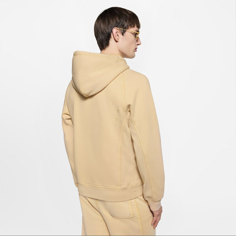 エフォートレスな夏の日々から着想を得た、海で泳いだ後のリラックスタイムに最適な淡いイエローのコットンフーディ。ウォッシュ加工を施したようなヴィンテージ風のガーメントダイ(後染め)で仕上げ、同系色のシグネチャーの刺繍とアイレットを添えました。袖下とサイドに沿って配した柔らかいリブ編みがデザインを一層引き立てます。揃いのショートパンツと合わせれば晴れやかなセットアップに。